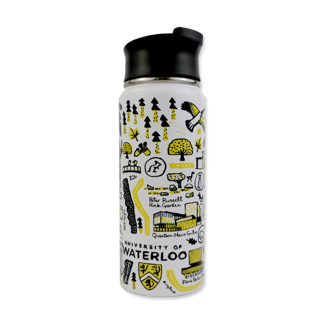 Stay hydrated in Warrior style with the Julia Gash UWaterloo Water Bottle. Featuring a full-colour wraparound design of Julia Gash’s signature artwork, this bottle is as functional as it is fun. Perfect for class, the gym, or on-the-go.