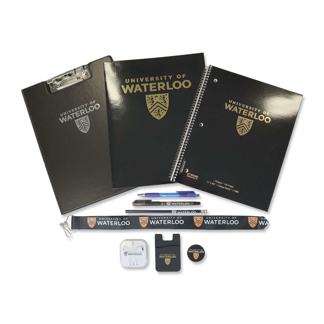 The UWaterloo Starter Pack includes the following: UWaterloo clipboard (black), UWaterloo one-subject coil notebook (assorted colours), UWaterloo 2-pocket folder (black); UWaterloo lanyard, UWaterloo phone wallet, UWaterloo phone grip, UWaterloo InkJoy pen (assorted colours), UWaterloo retractable pen (assorted colours); UWaterloo wood pencil (assorted colours), UWaterloo white earbuds.