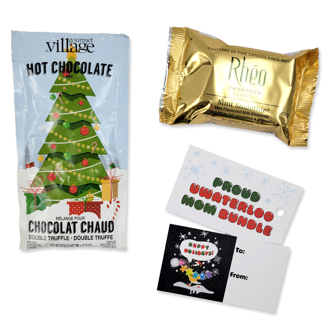 The perfect stocking stuffer for any proud UWaterloo Mom! This limited-edition holiday gift bundle includes a UWaterloo Mom 16 oz. mug, a Rheo Thompson milk chocolate mint smoothie bar and assorted hot chocolate package.