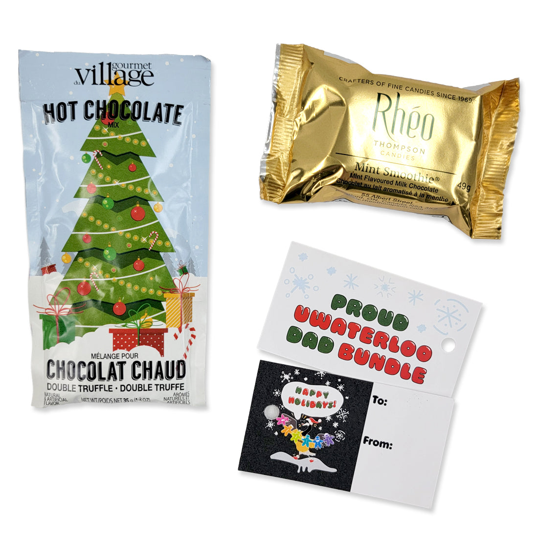 The perfect stocking stuffer for any proud UWaterloo Dad! This limited-edition holiday gift bundle includes a UWaterloo Dad 16 oz. mug, a Rheo Thompson milk chocolate mint smoothie bar and assorted hot chocolate package.