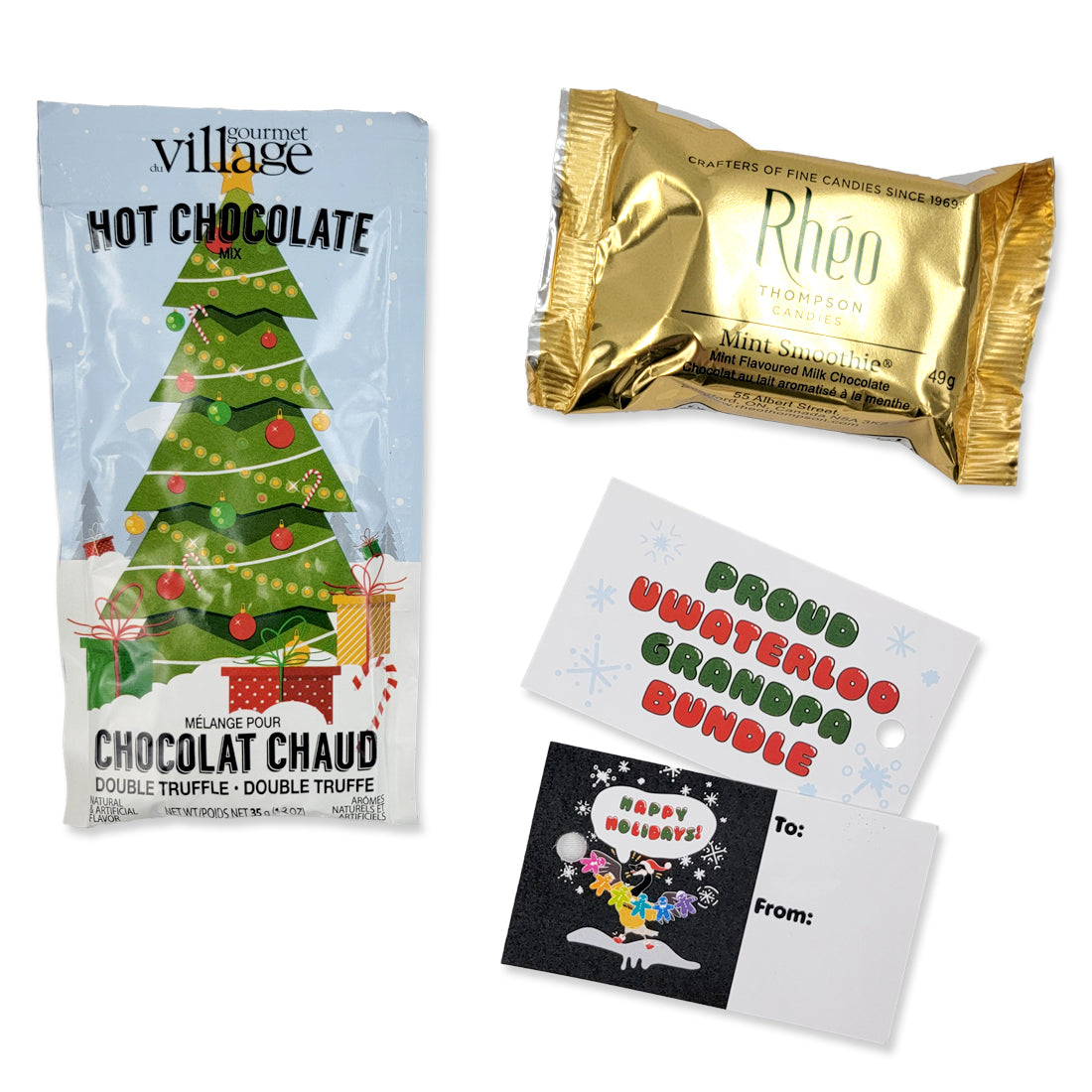 This holiday bundle is a great gift for anyone looking for a special gift for Grandpa this holiday season. This bundle comes with a 16 oz. UWaterloo Grandpa mug, a Rheo Thompson milk chocolate mint smoothie bar and assorted hot chocolate package.