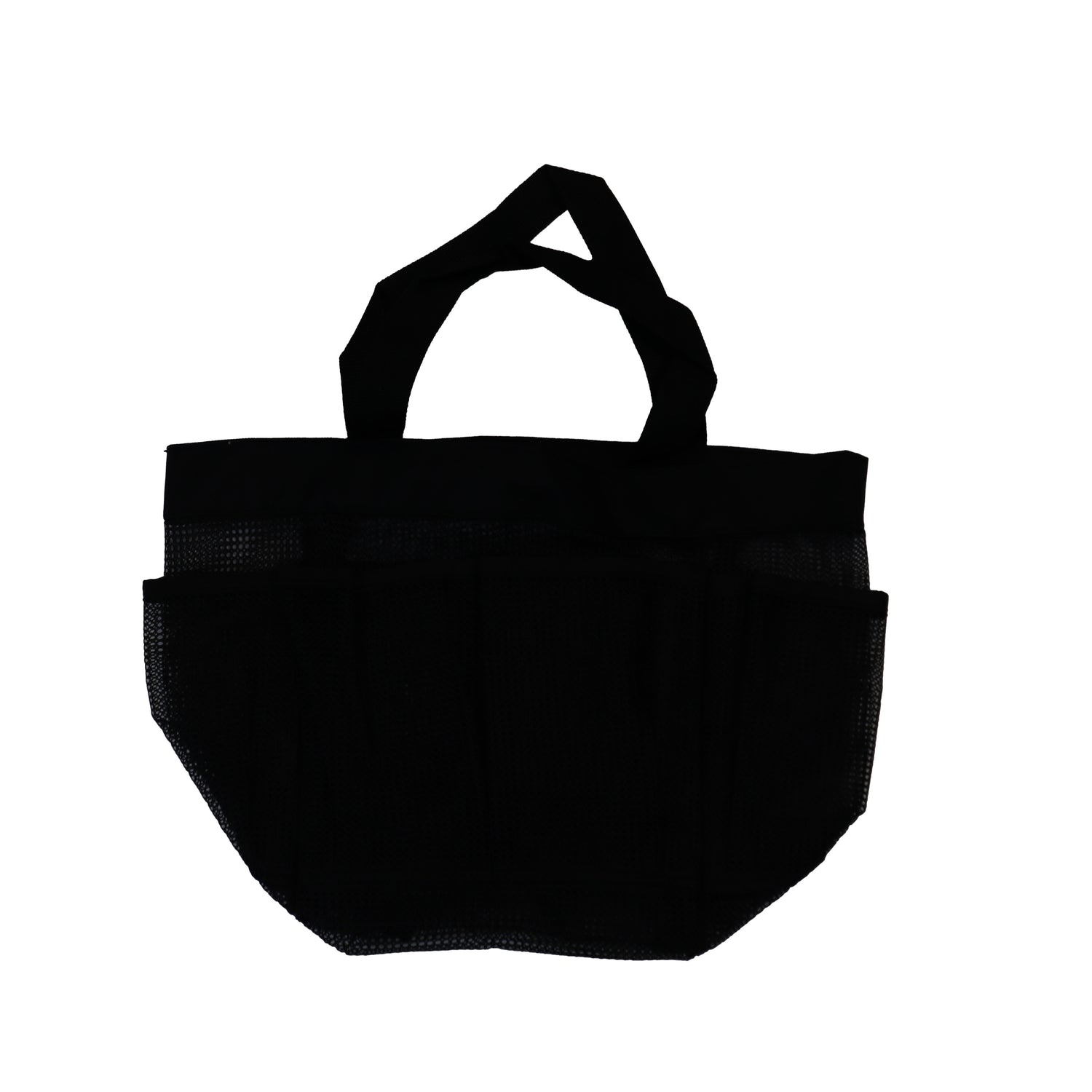 Black mesh shower caddy tote. Approximately 14 cm (width) x 18 cm (long) x 20 cm (height).